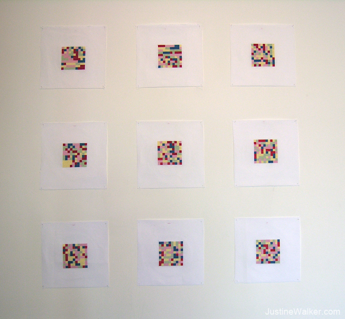 A4 sheets of coloured paper (blue, red, pink, yellow and green) have been cut into 4cm wide strips of paper. The strips have been shuffled together. As a strip is removed from the resulting pile, it’s corresponding colour is cross stitched into the next square of the grid. Each square is made up of 5 x 5 cross stitches; each grid is made up of 10 x 10 squares. The series continues.